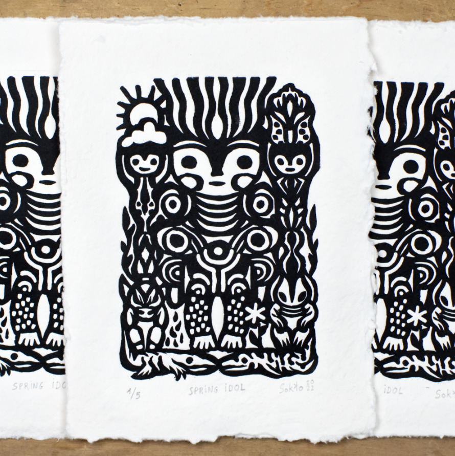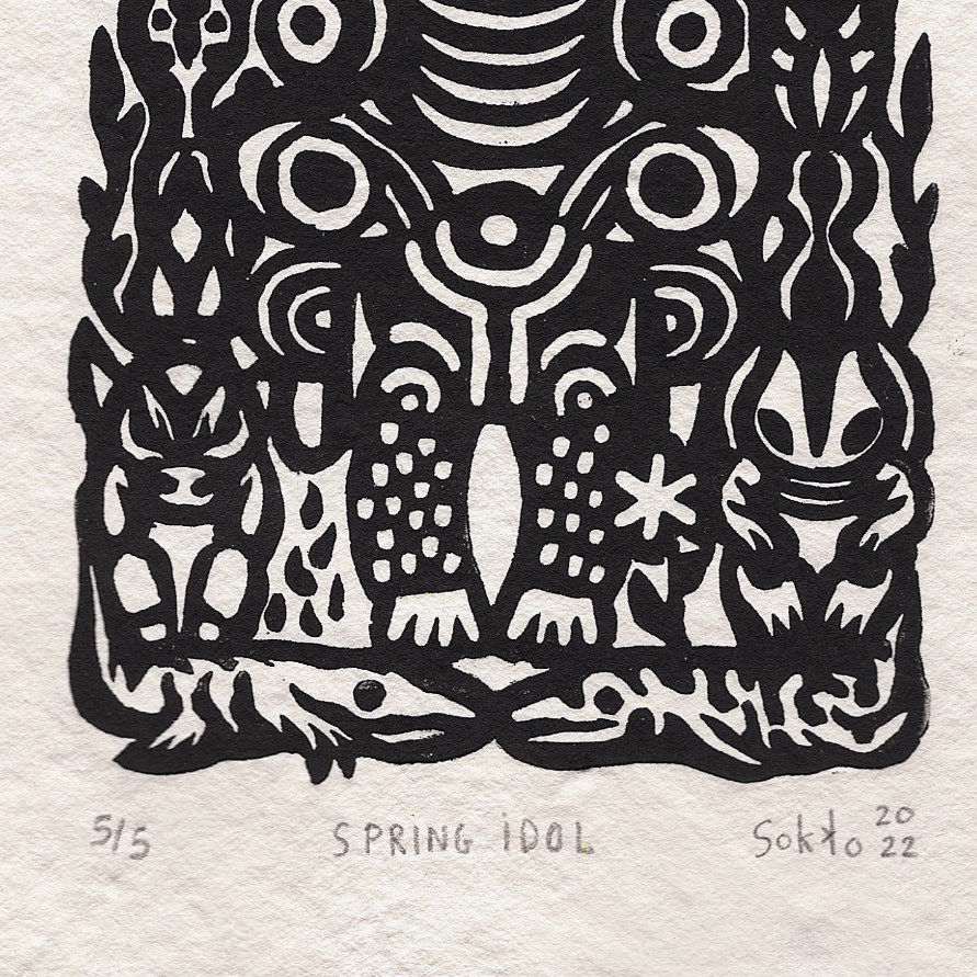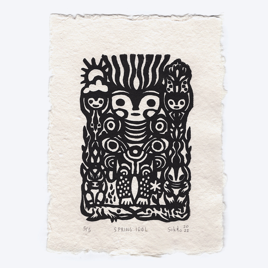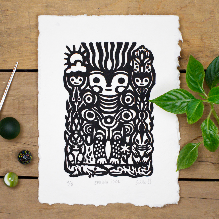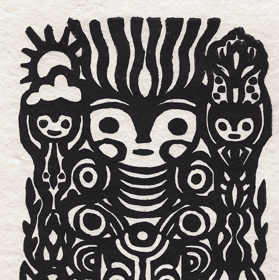 A handmade linocut print inspired by nature and ancient anthropomorphic idols.